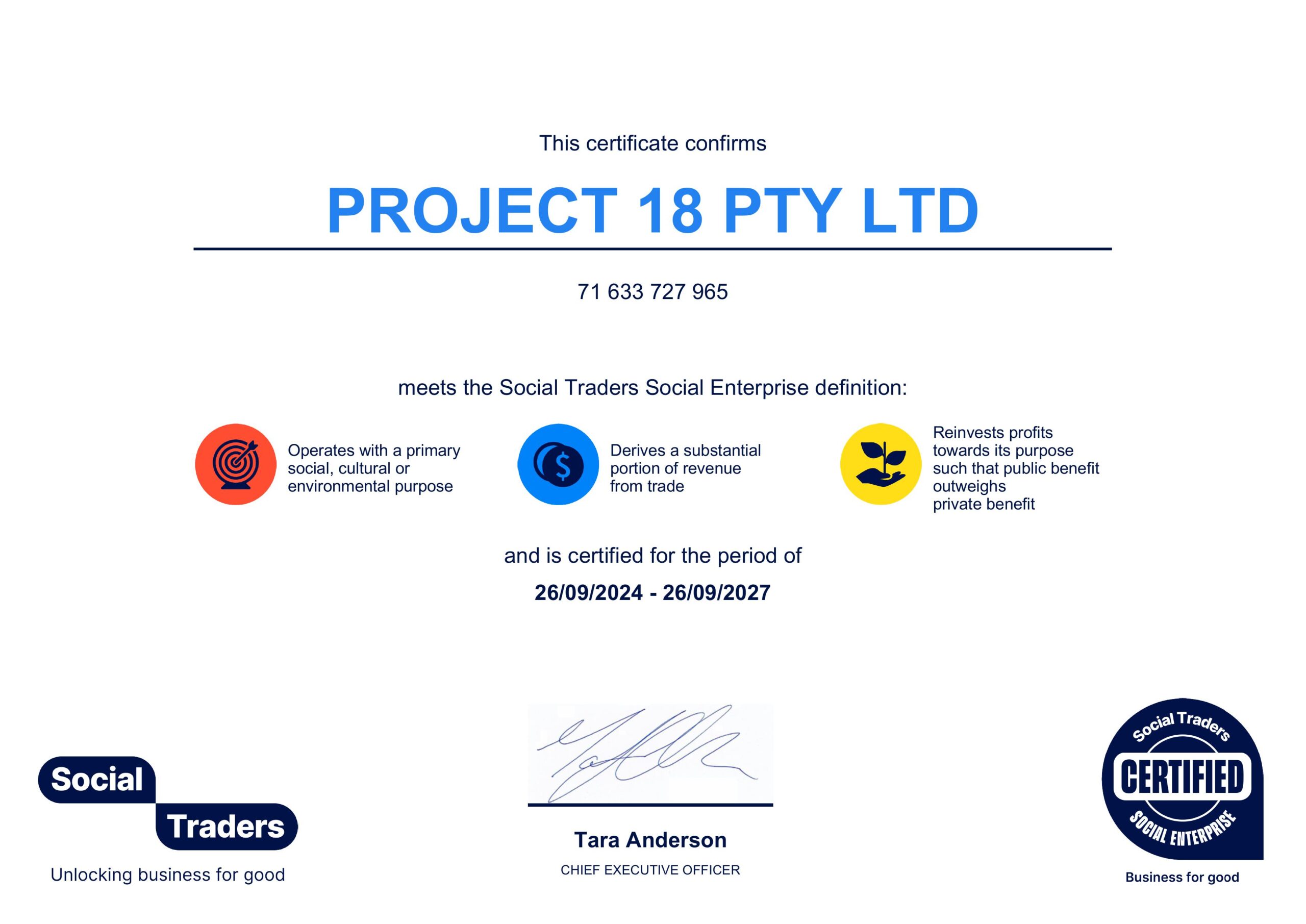 In September 2023, Project 18 Pty Ltd became certified as a Social Enterprise by Social Traders.